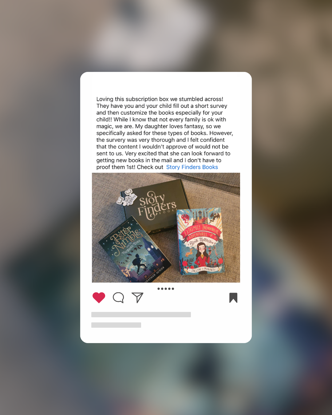 Story Finders is a monthly book subscription box for kids that is personally individualized each month for your child’s reading level and interests. We also seek to honor parents' input for specific content to include or avoid in the book selection.